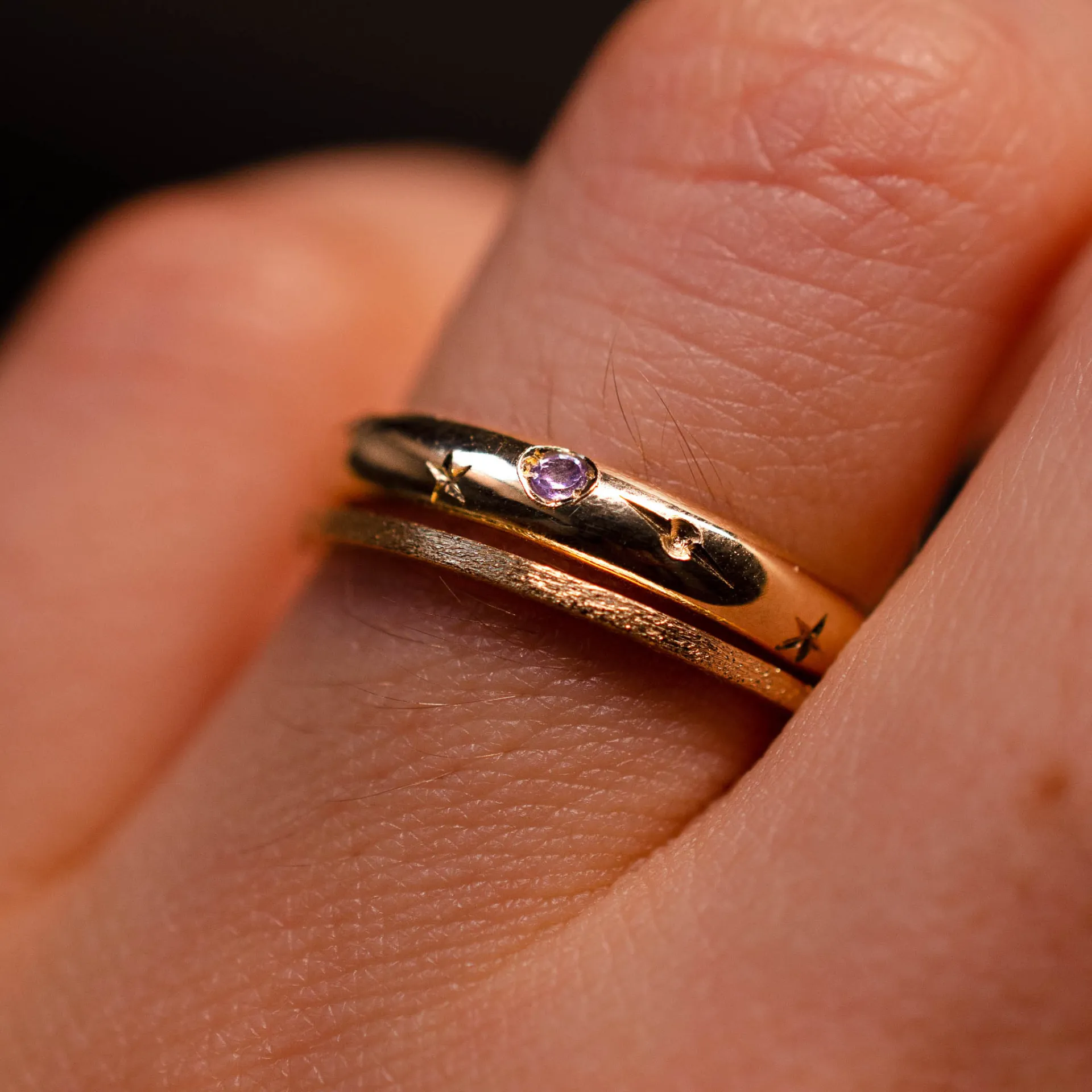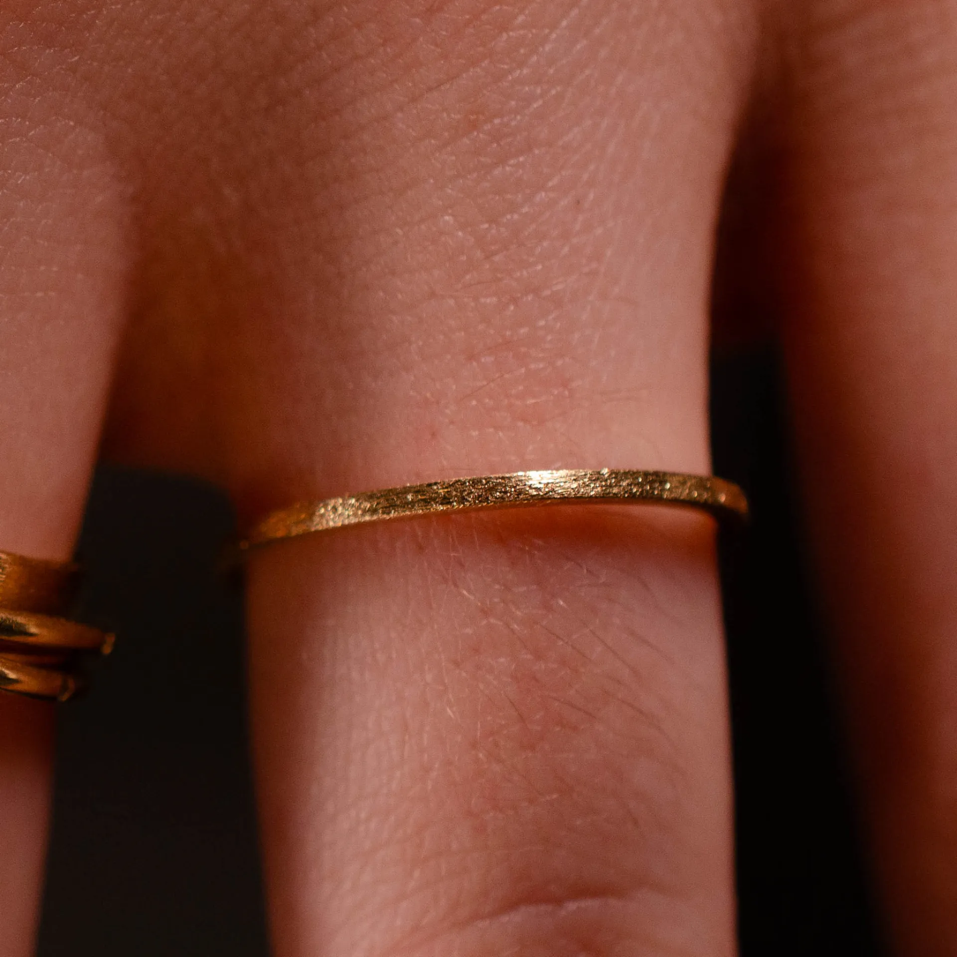 Anel de aro reto de 1.2mm em ouro amarelo 18k com acabamento fosco e textura stardust.