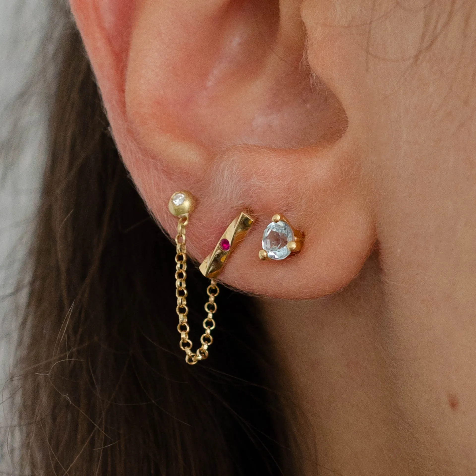 Brinco torcido em ouro 18k com pedra natural cravada ao centro.