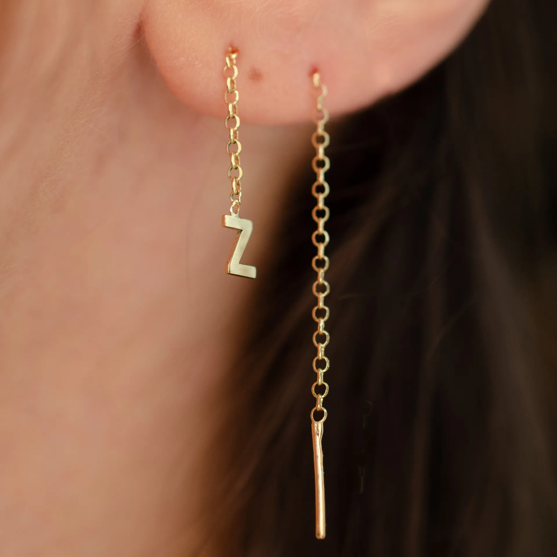 Brinco em ouro amarelo 18k com corrente fina e pingente de inicial.