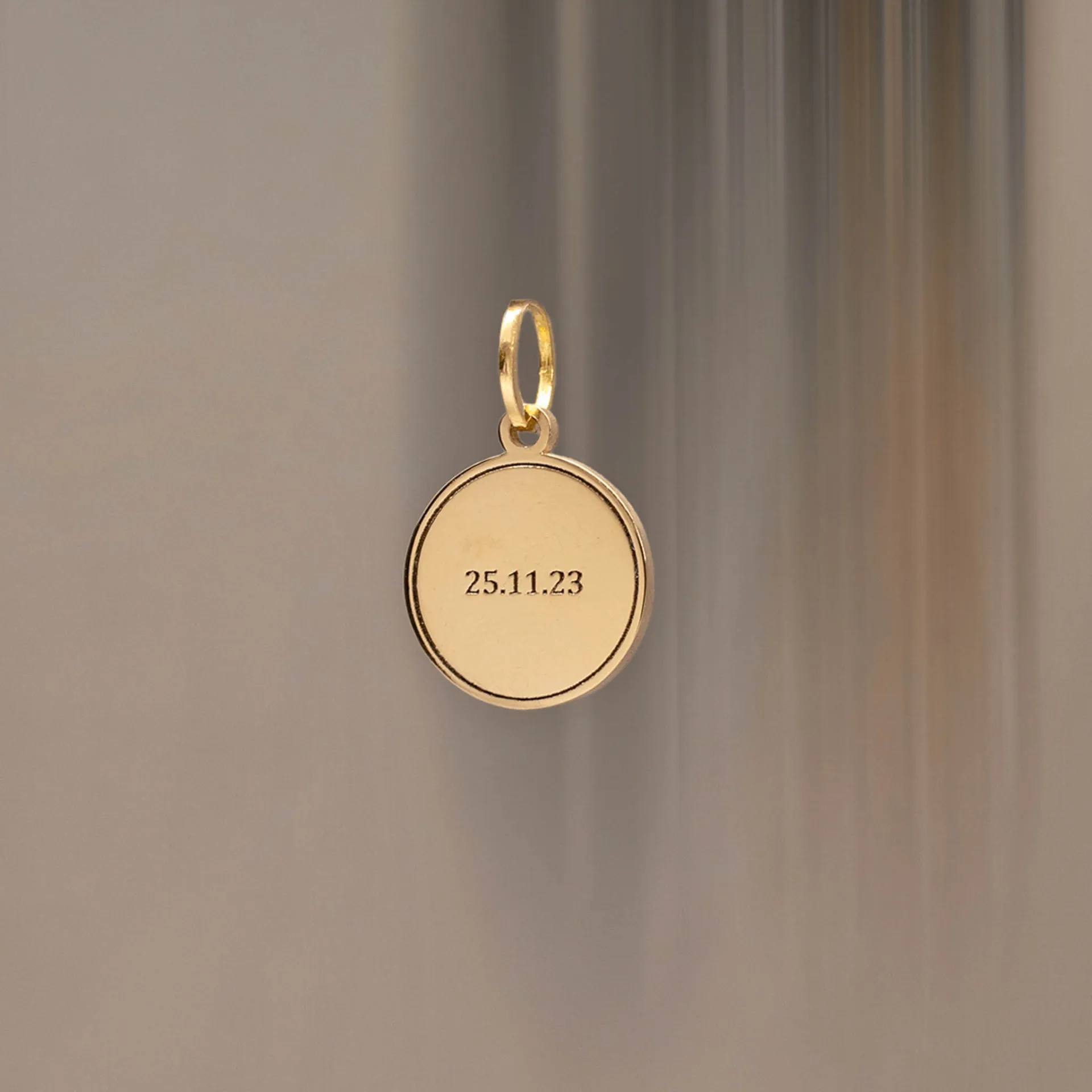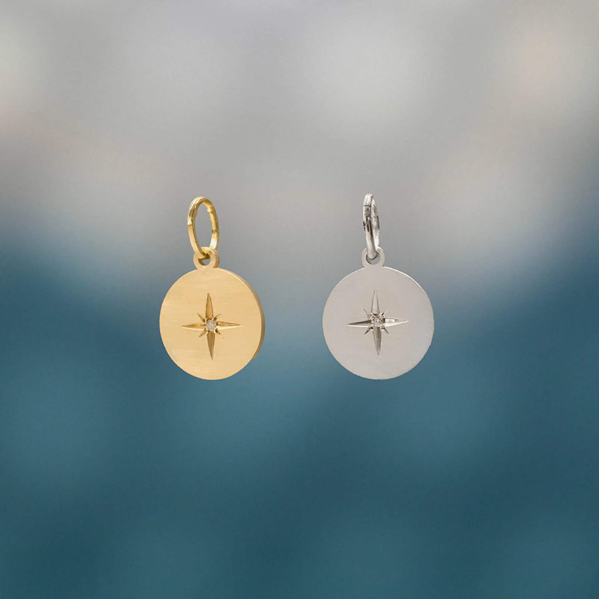 Pingente estilo medalha redonda de 10mm em ouro 18k e gravação de estrela guia e diamante natural no centro.