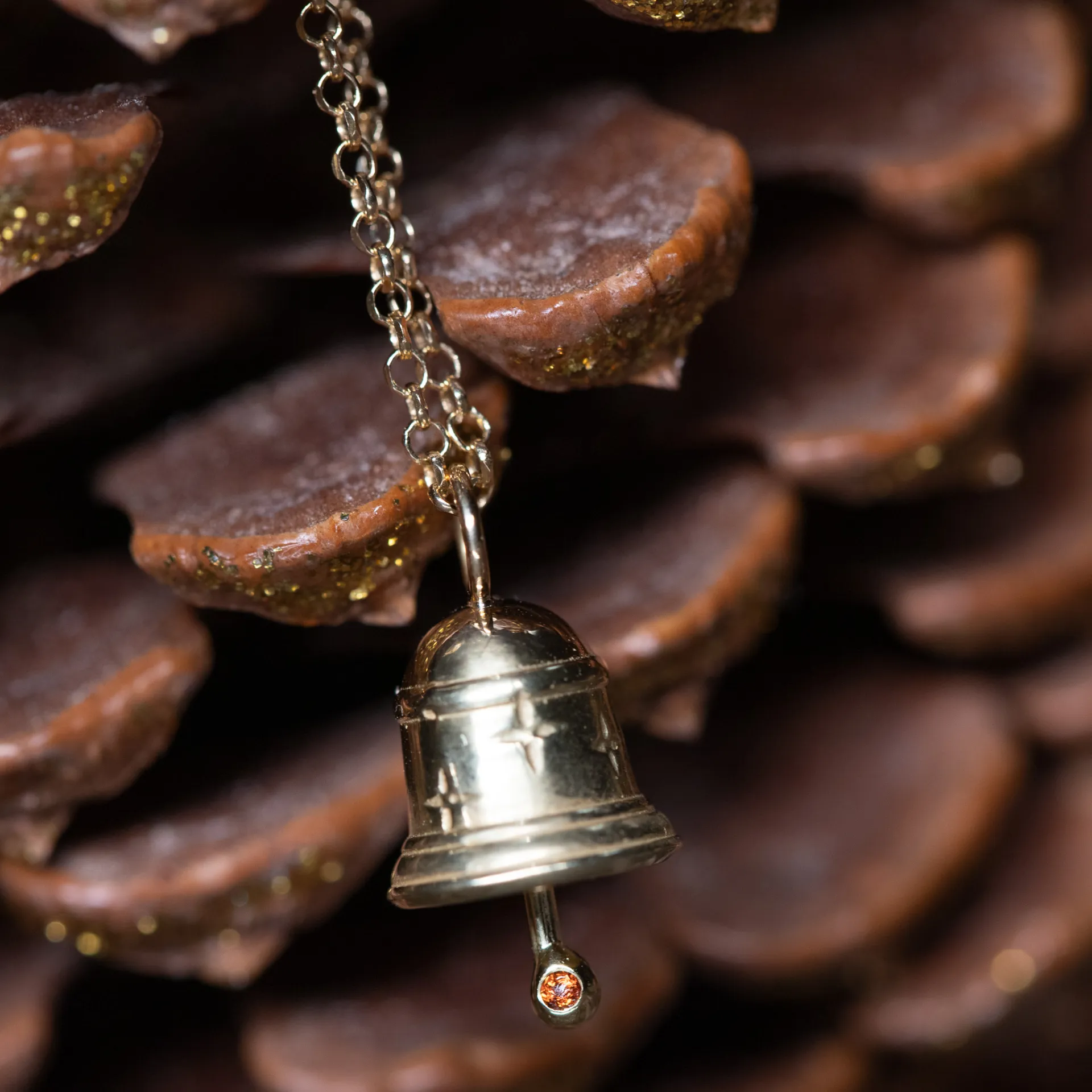 Pingente em ouro 18k com delicadas gravações e uma granada cravada no pêndulo. O sino traz movimento e luz; o olho, à altura do coração, simboliza a intuição; e as estrelas, nossos desejos, sempre presentes como guias.