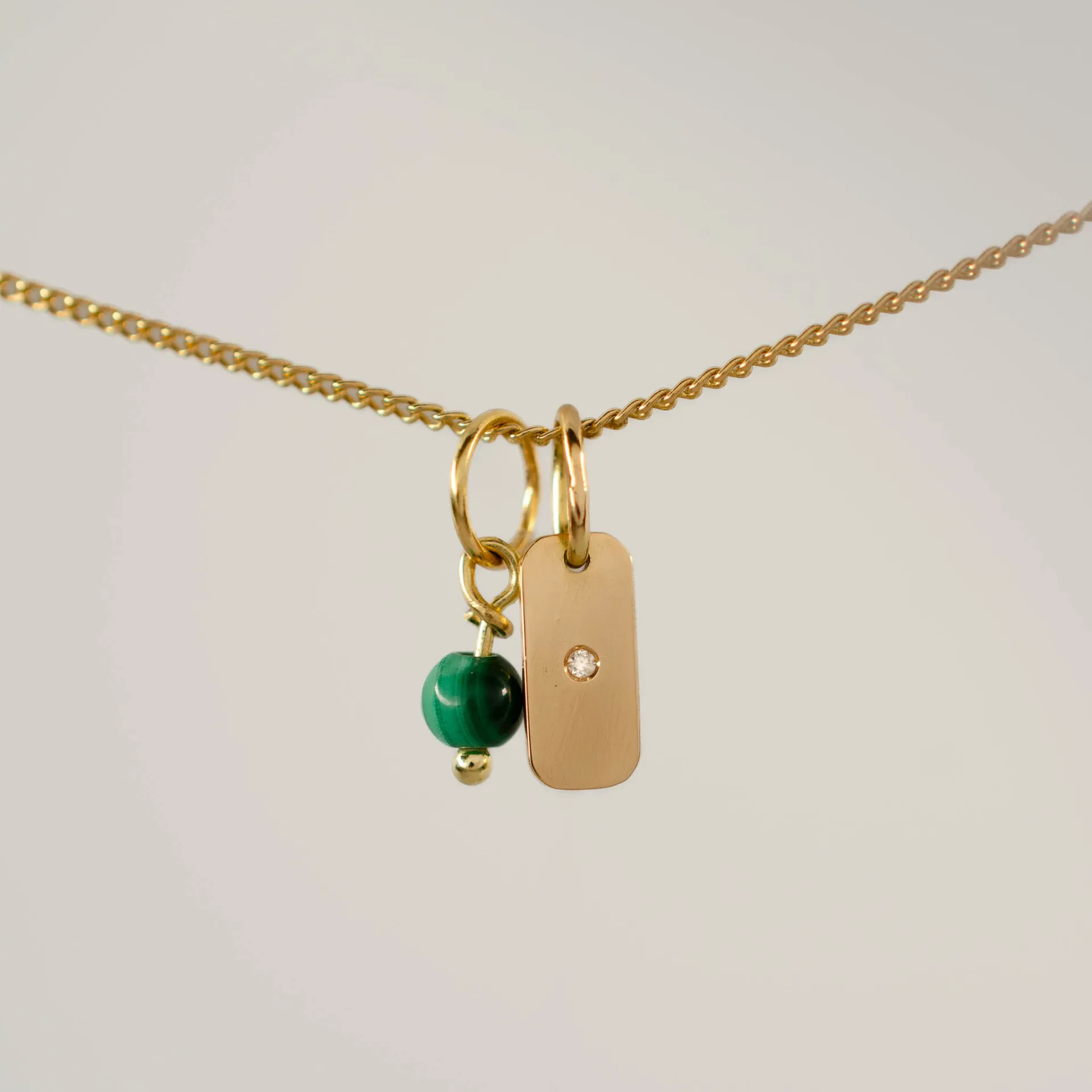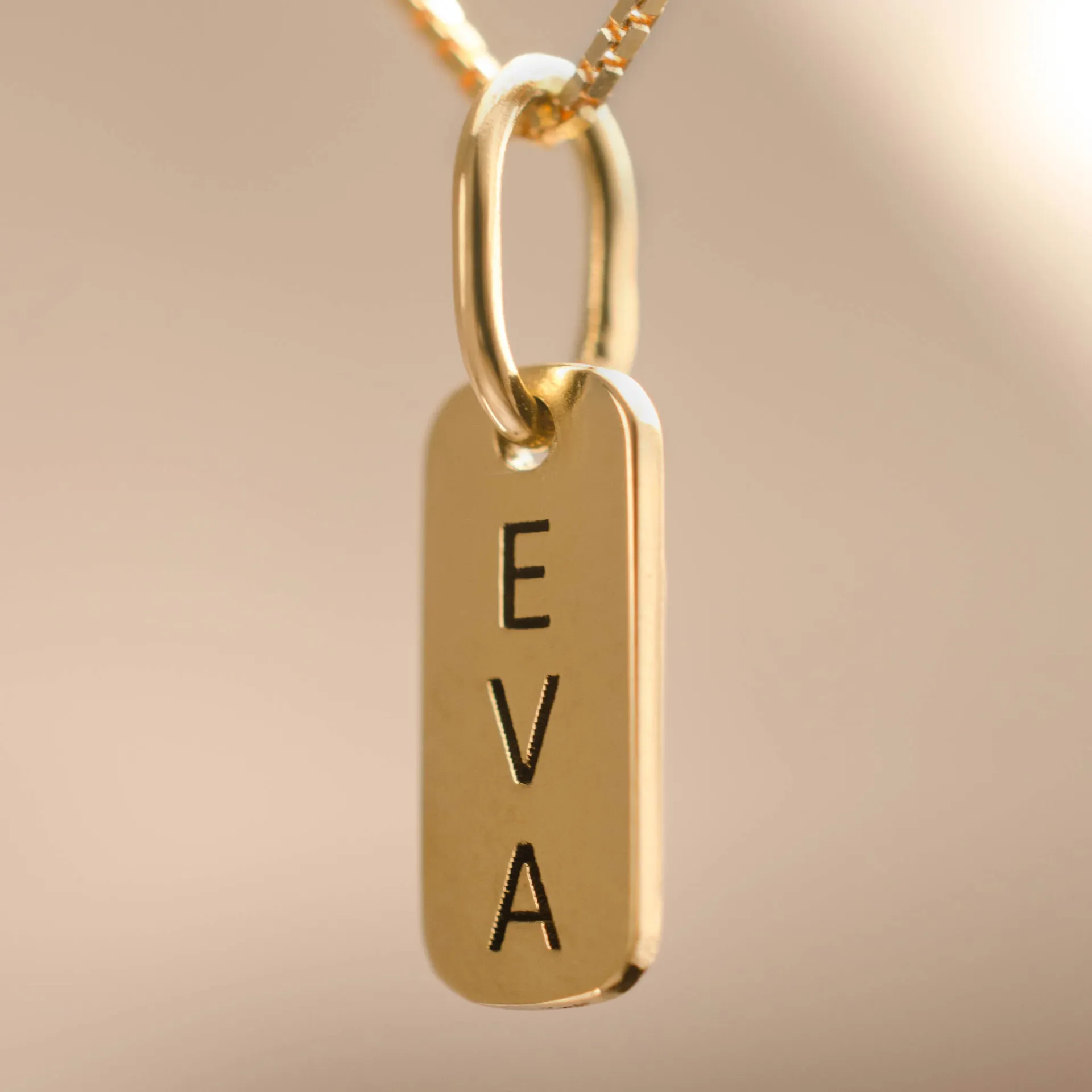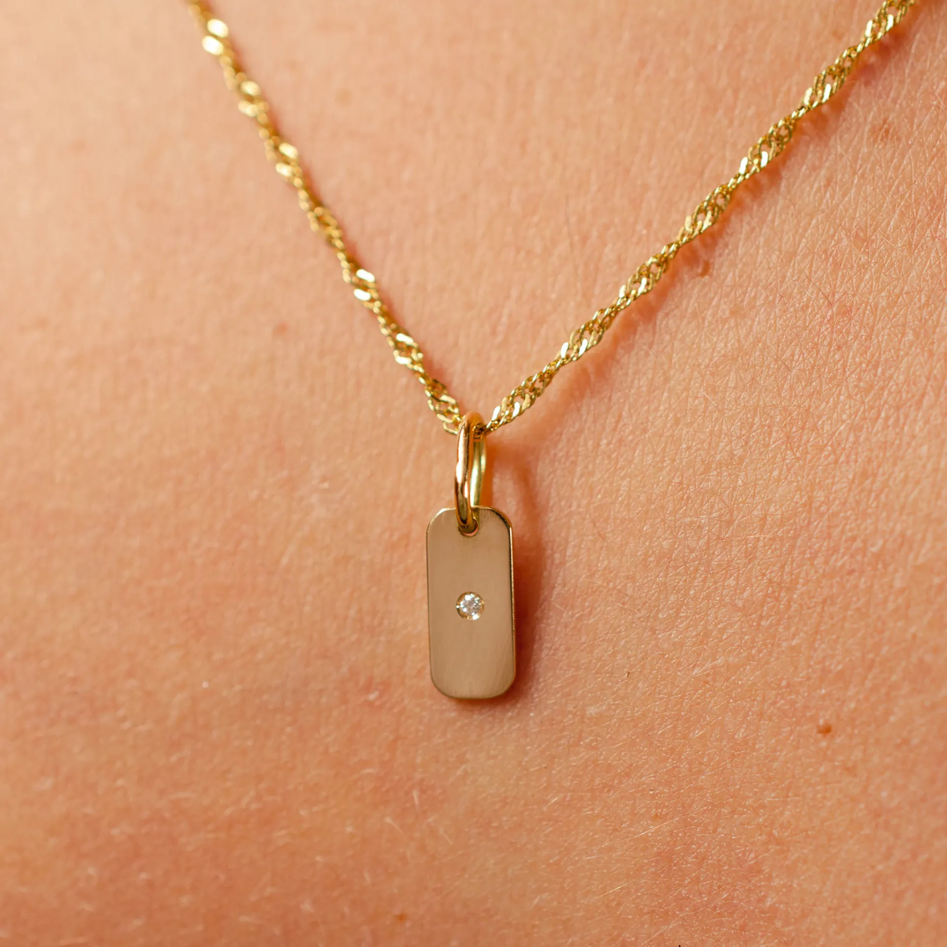 Pingente em ouro 18k de 9 x 4mm que pode ser gravada com iniciais, números ou símbolos especiais. No verso, uma pedra natural fica cravada para tocar a pele, na altura do coração.